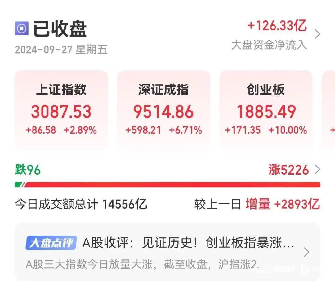 截至当日收盘,上证指数报3087.53点,涨2.89%;深证成指报9514.86点,涨6.71%;创业板指报1885.49点,涨10.00%,北证50指数报717.02,涨11.14%。